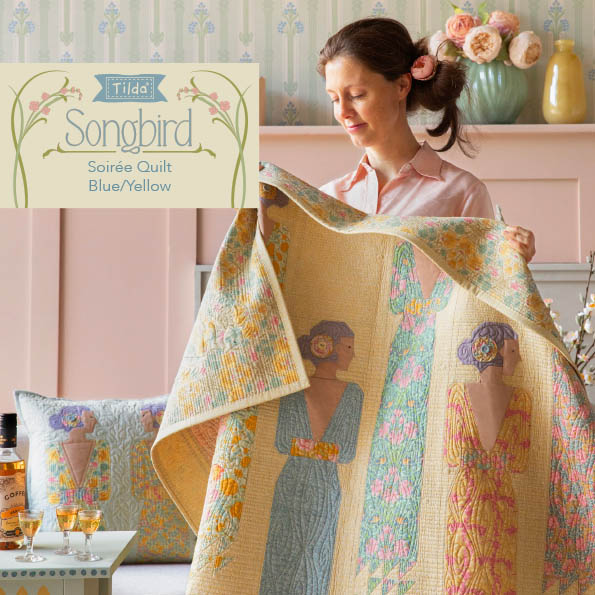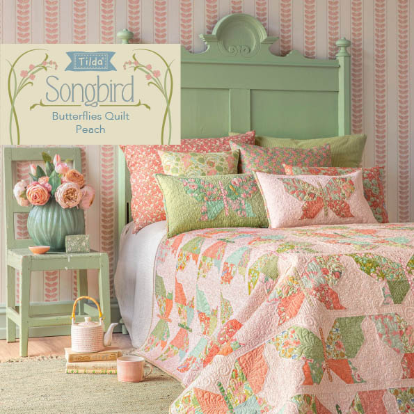 Se la natura è il tuo rifugio, questa deliziosa trapunta è perfetta per te con i suoi paperbird che volteggiano su ghirlande di spago. Gli uccelli sono disposti in colonne sfalsate, con fasce tra alcune delle file. Ci sono due versioni della trapunta: questa mostra i tessuti Sanctuary su uno sfondo bianco stucco, con l'aggiunta di una deliziosa selezione di tessuti Chambray che completano magnificamente i tessuti stampati riposanti. Visita tildasworld.com per la versione della trapunta in colori prussiani.