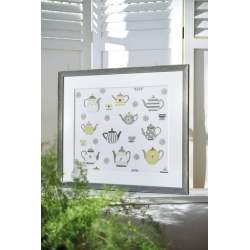 I vari motivi e soggetti si alternano a motivi fini e chiari in varie tonalità di grigio: una serie di splendidi disegni di galline, una sequenza di piccole teiere, prati fioriti estivi.
