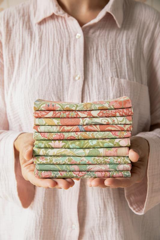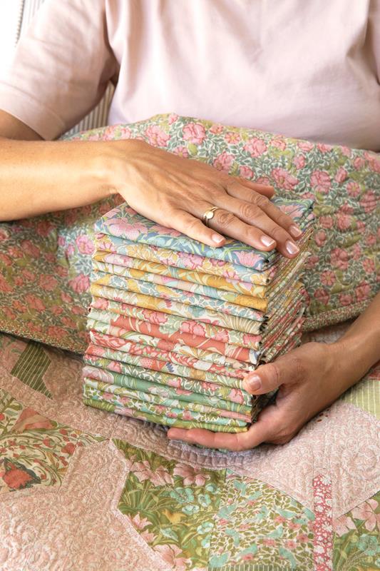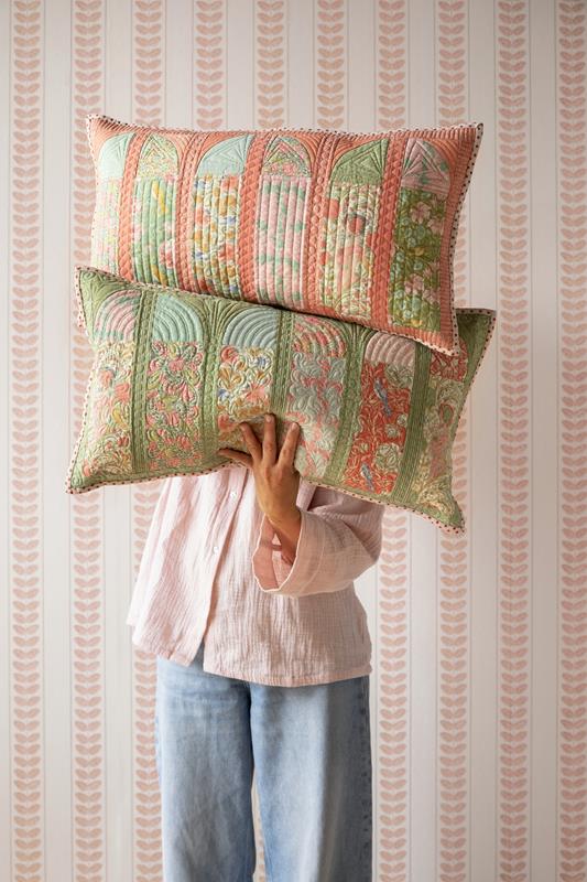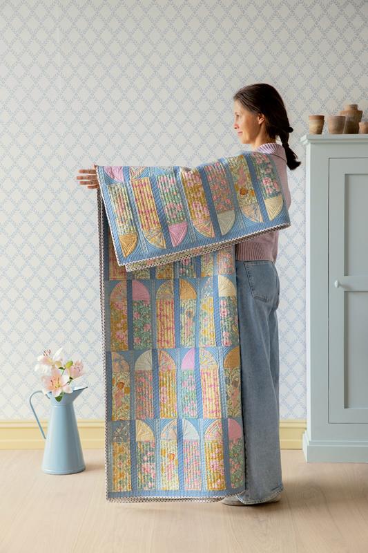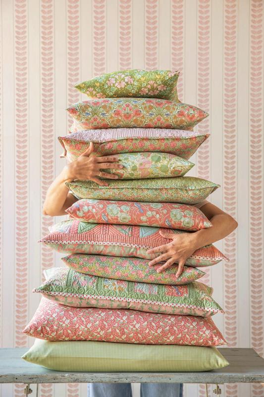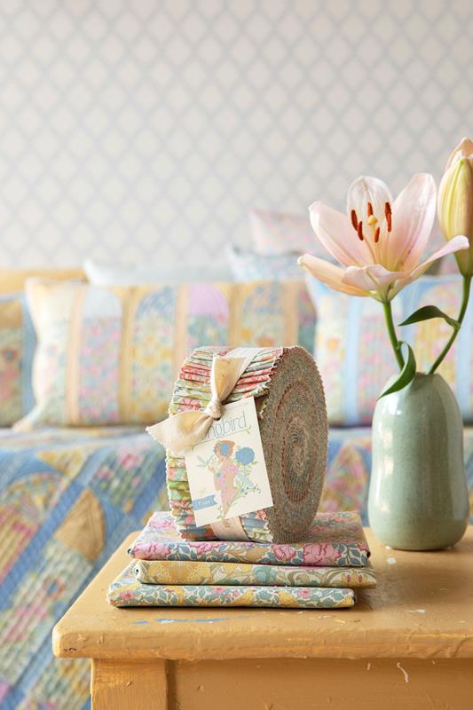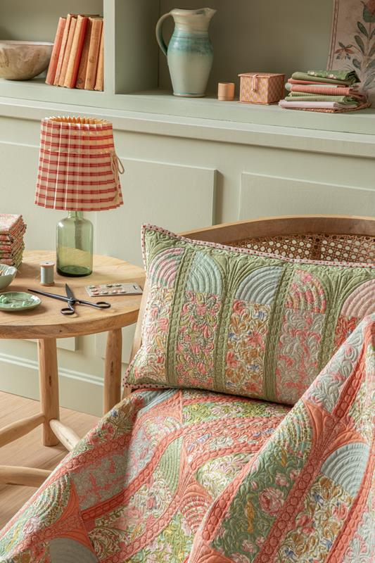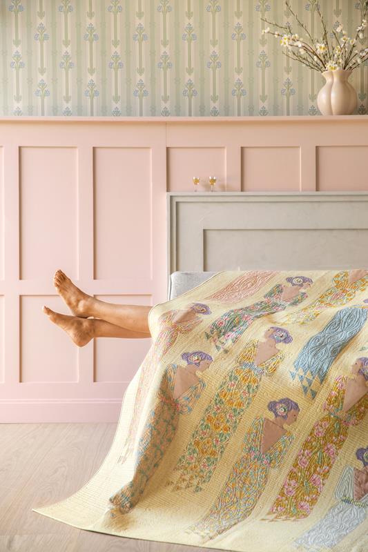 Quando penso a questo periodo storico, pur sapendo che non mancavano le difficoltà, la mia mente va alle soirées, con dame in splendidi abiti nei giardini colonnati, circondate da libellule e farfalle, motivi molto utilizzati nell’Art Nouveau. Questo immaginario ha ispirato i quilt e i cuscini che accompagneranno la collezione. Il quilt Mosaic Butterfly del 2020 era perfetto per questo progetto ed è stato rinnovato nei pastelli polverosi di Songbird, affiancato dai quilt e cuscini Garden View e Soirée.