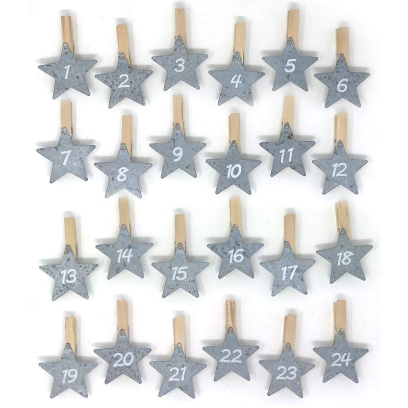 Mollettine in legno per realizzare il calendario dell'Avvento, con stelle numerate in lamiera sottile.