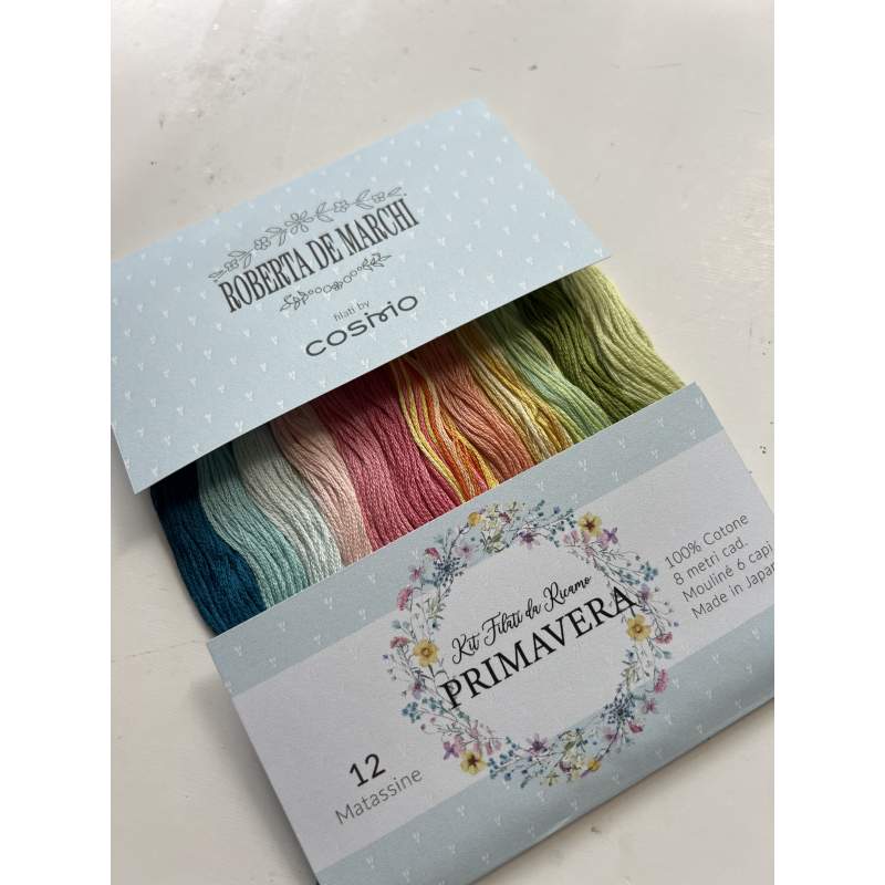 Kit da ricamo formato da 12 filati Cosmo moulinè a 6 capi n.25, 100% cotone, in colori primaverili: rosa, verdi, gialli, azzurri. Misti tinta unita e sfumati.