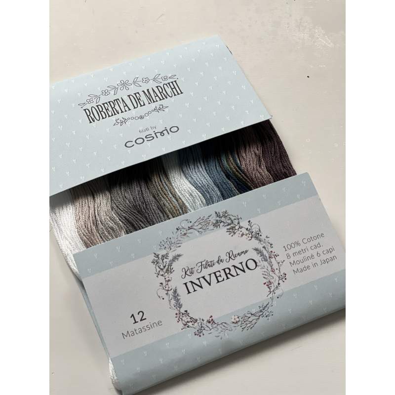 Kit da ricamo formato da 12 filati Cosmo moulinè a 6 capi n.25, 100% cotone, in colori invernali: grigi, tortora, marroni, azzurri.