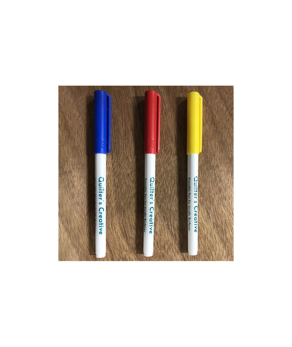 Set di 3 penne cancellabili per superfici acriliche. Include i colori blu, rosso e giallo.