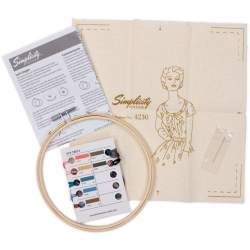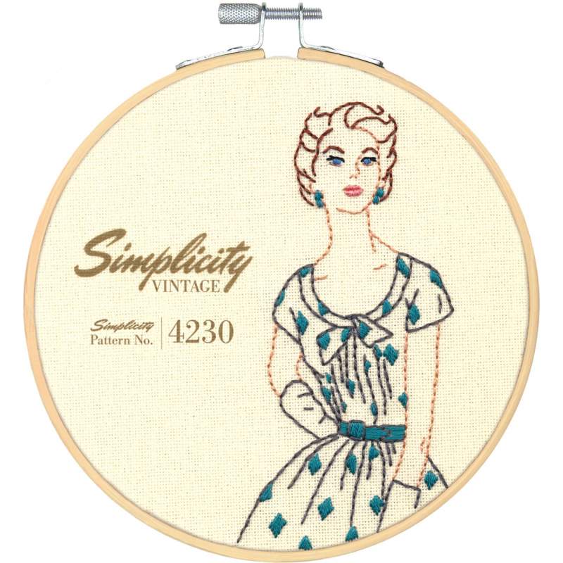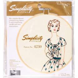Kit Simplicity Vintage da ricamare, pattern n.4230. Il kit include tutto il necessario: tessuto prestampato color avorio, filo da ricamo, telaio in legno, ago e semplici istruzioni. Dimensioni: 6 pollici di diametro (15,2 cm).