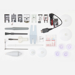 Include: DESIGNER™ Royal Hoop (360x200 mm), DESIGNER™ Splendid Square Hoop (120x120 mm), 10 piedini premistoffa, 16 fermagli, comando a pedale, aghi, coprimacchina, filo nuovo, cacciavite, strappacuciture, spazzola, perno ausiliario per il rocchetto, copri rocchetto (grande, medio e piccolo), feltrino, guida per bordi/quilting e un utensile multiuso/canna a bottone.