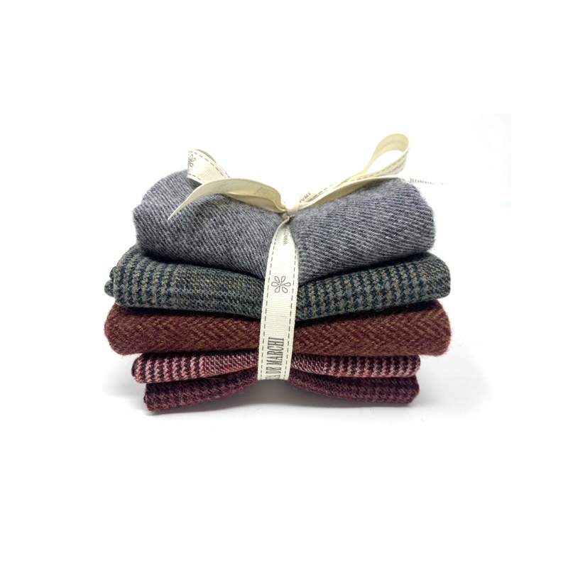 Pacchetto di 5 tessuti in lana di alta qualità in nuance di colore come da foto. Ogni tessuto ha dimensioni variabili di circa 20 x 36 cm. E' perfetto da utilizzare per piccole applicazioni in lana, piccole parti di bambole, pupazzi o altri lavori di cucito creativo ma anche come base per gli esagoni ricamati.
