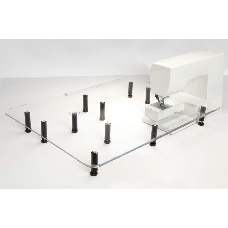Tavola di prolunga per qualsiasi macchina per cucire. Costruita in acrilico con piedi rimovibili, per poter essere trasportata o conservata. Versione Basic Giant: